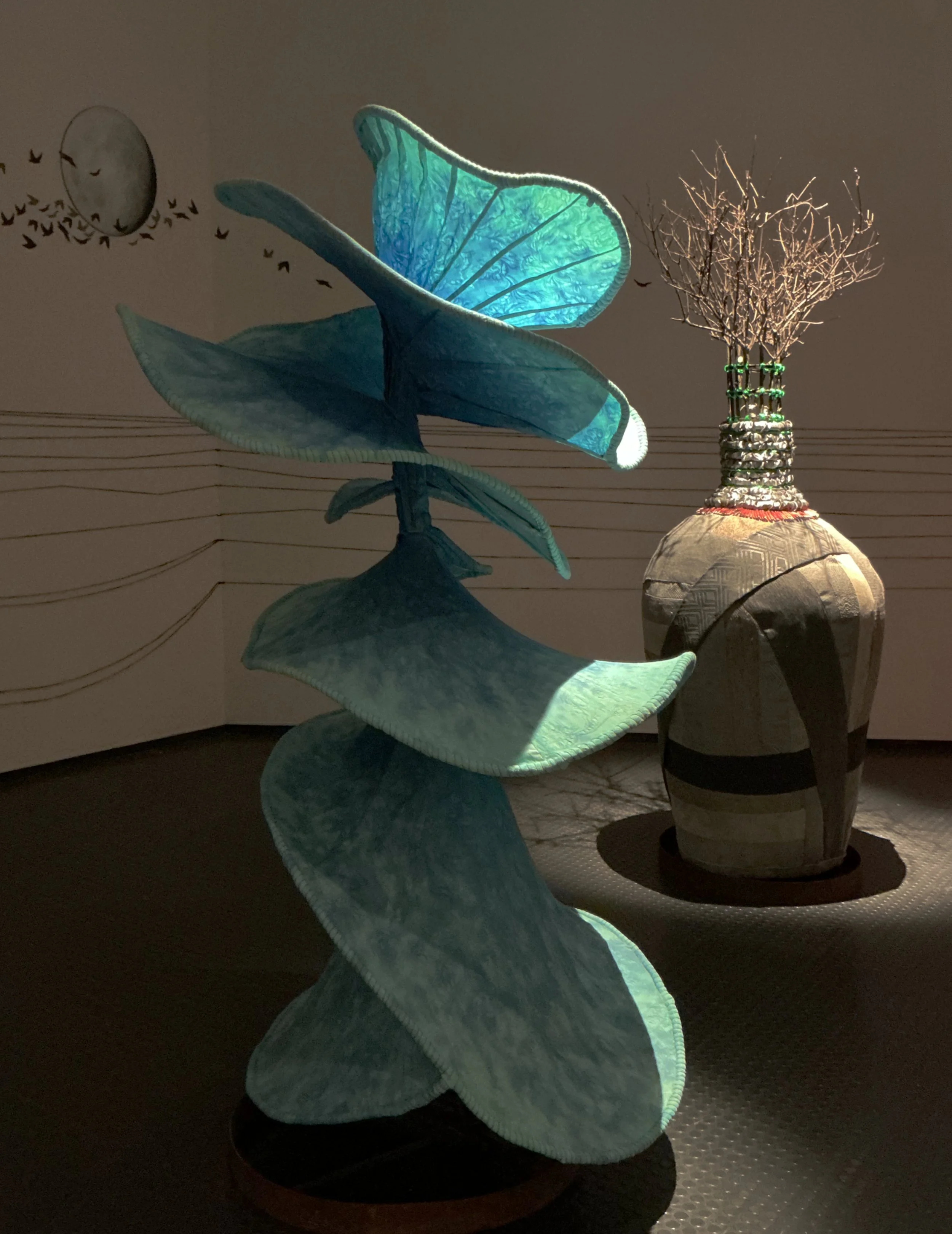 Murmuration combines large fabric sculptures, string and cut out paper, moving lights and sound.